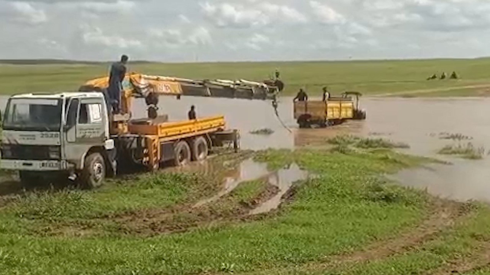 yükselen dereden traktörle geçmeye çalışan 3 kişi, iş makinesine bağlanan halat
